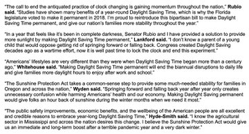 Press Releases - U.S. Senator for Florida, Marco Rubio Mar 09 2021 Washington, D.C. — U.S. Senators Marco Rubio (R-FL), James Lankford (R-OK), Roy Blunt (R-MO), Sheldon Whitehouse (D-RI), Ron Wyden (D-OR), Cindy Hyde-Smith (R-MS), Rick Scott (R-FL), and Ed Markey (D-MA) reintroduced the Sunshine Protection Act, legislation that would make Daylight Saving Time (DST) permanent across the country.